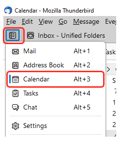 No Mozilla Thunderbird os calendários estão disponíveis a partir do menu Spaces no canto superior direito: