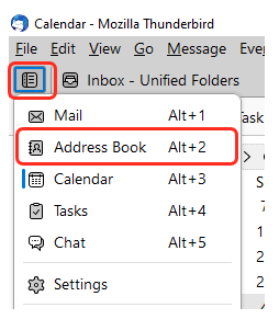 No Mozilla Thunderbird os contactos estão disponíveis a partir do menu Spaces no canto superior direito: