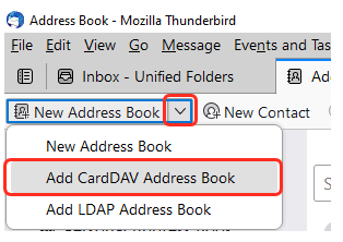 - Para iniciar a configuração clique sobre a seta que segue o botão New Address Book seguido de Add CardDAV Address Book: