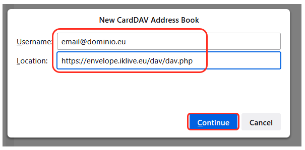 - No campo Username introduza o seu endereço de e-mail do Envelope seguido do endereço https://envelope.iklive.eu/dav/dav.php no campo Location: