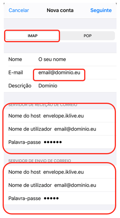 Configuração das contas de correio eletrónico do serviço Envelope Mail no cliente de email do Apple iOS.