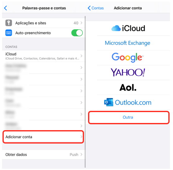 1. Pressione a opção, Adicionar conta e de seguida Outra: