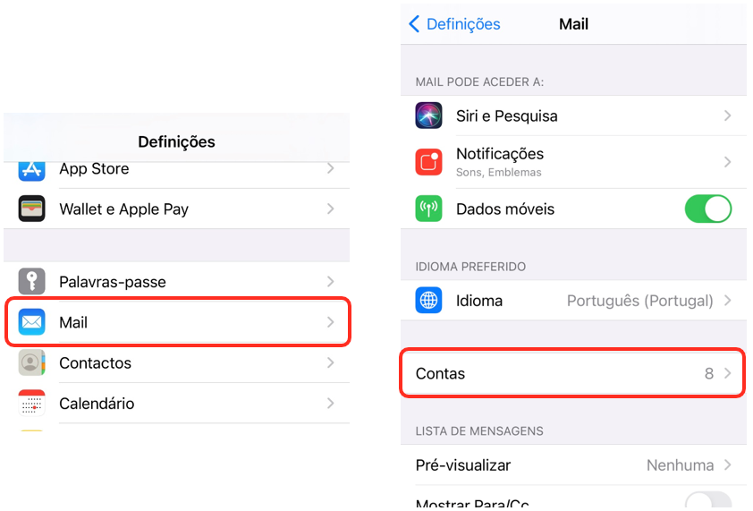 2. Navegue e selecione a opção Mail seguido de Contas: