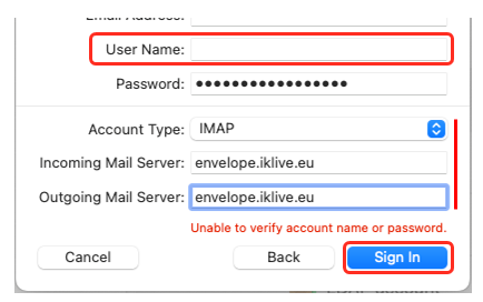 - Caso seja solicitado introduza agora em User Name o seu endereço de e-mail e no Incoming e Outgoing Mail Server introduza envelope.iklive.eu como demonstrado: